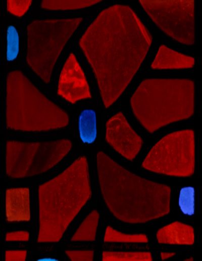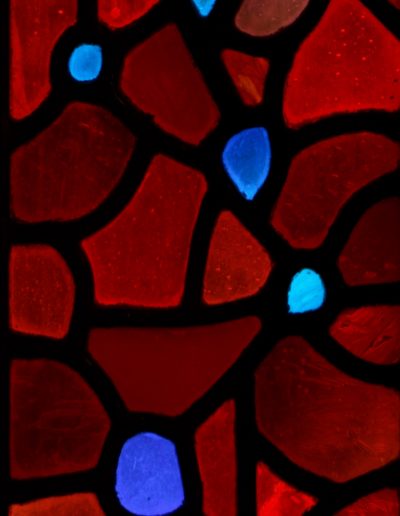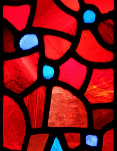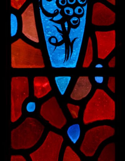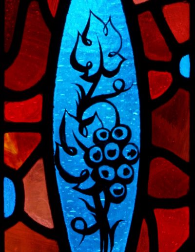 This is the second of the two Eucharist-themed windows that Rowan and Irene created to frame the double doors at the west end of the church. Instead of using painting or crosshatching on the reds in these windows, they control the light here solely by their choice of glass. The mixture of reds makes for a wonderful texture that sets off the blue grapes perfectly and ties this window to its complement on the other side of the entrance.