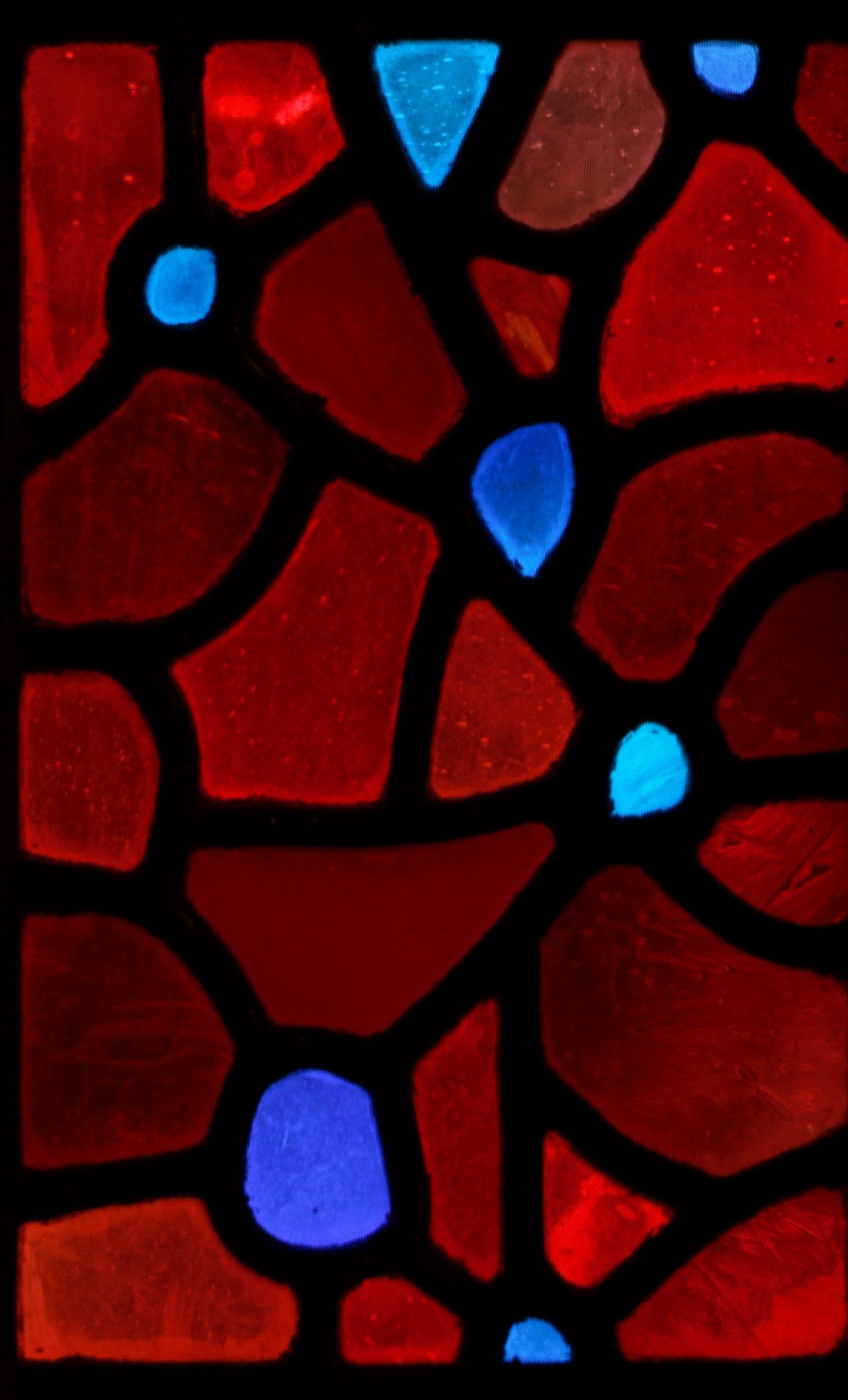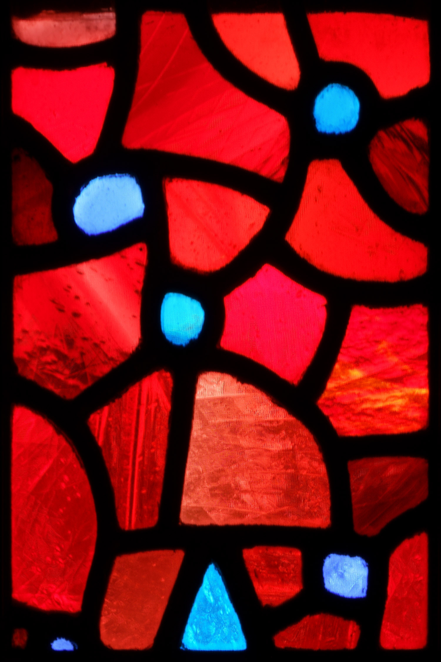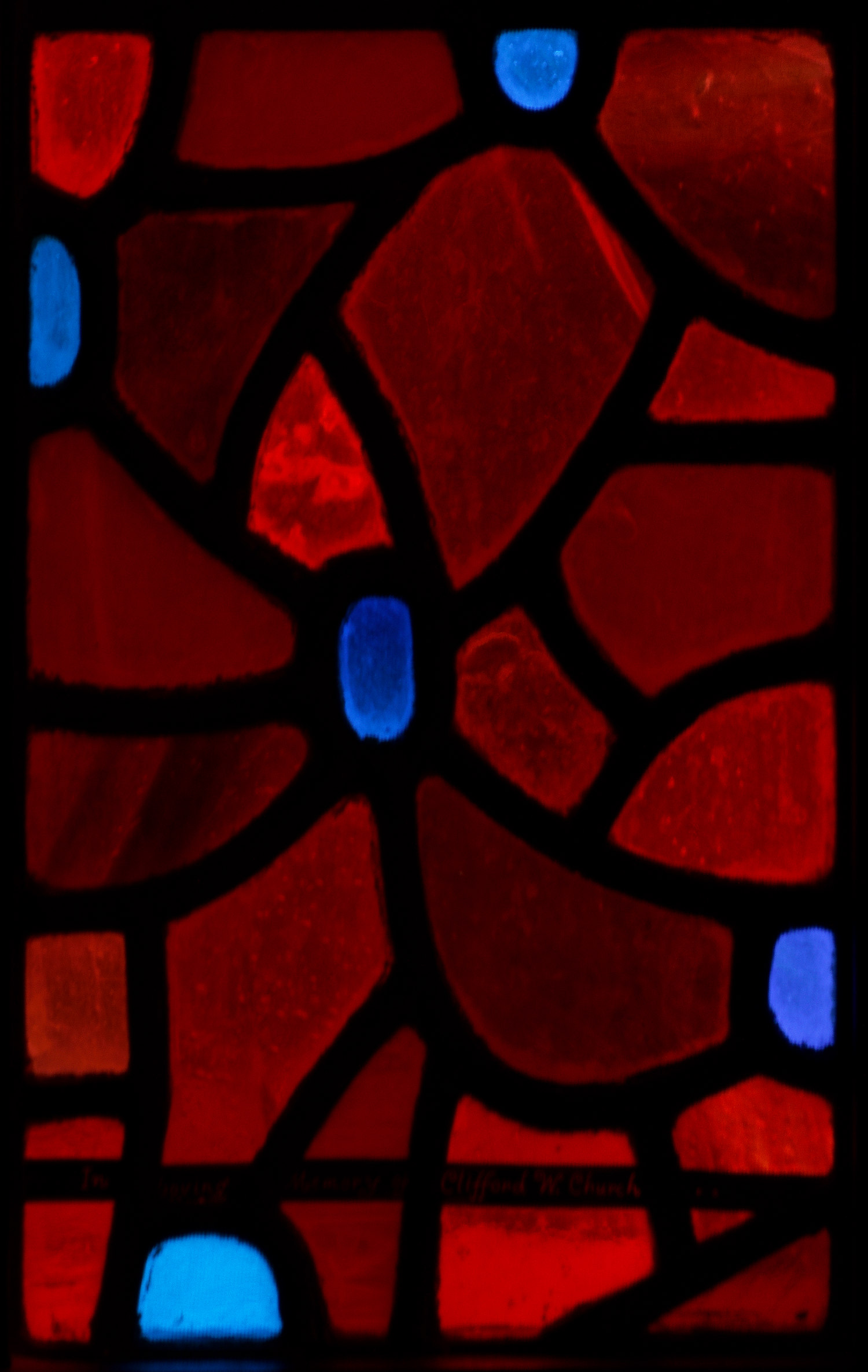 This is the second of the two Eucharist-themed windows that Rowan and Irene created to frame the double doors at the west end of the church. Instead of using painting or crosshatching on the reds in these windows, they control the light here solely by their choice of glass. The mixture of reds makes for a wonderful texture that sets off the blue grapes perfectly and ties this window to its complement on the other side of the entrance.